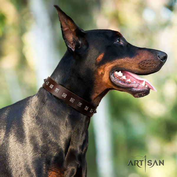 Do you enjoy stylish things? Let your darling Doberman enjoy wearing such accessories on! Choose this best quality leather dog collar with embellishments from FDT Artisan. This gear is designed for those who just adore elegant style. In this significant collar, your dog will have more severe, but handsome look. Your cute four-legged friend will get the finest treatment when wearing this supply. Full grain leather is absolutely safe.