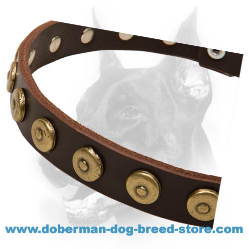 If you are about to make your best canine you need to choose dog collar for him. Not a usual one but dependable, comfortable and quality! Only in this case you will grow up a dog-champion! Not a winner of championships but a winner of worldwide recognition as for his working career and good behavior! The best victory of each dog is his long useful life and faithful service to his owner. Dogs can’t know what they get from us, how many contributions to their management and treatment are made throughout all their life. To be honest, it does not matter, as the pleasure they give us is invaluable!! Dobermans are noble animals and you should emphasize their nobility all the time! Walking your Doberman outside you make everyone know who he is canine King of course! Our Brand Leather Studded Dog Collar is meant for true Kings!