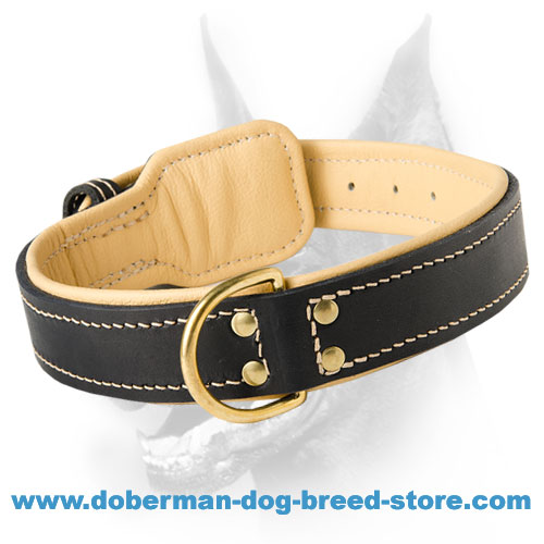 Comfortable leather collar that should be worn daily – walking or training your Doberman will not even realize that he is wearing it. Besides, the collar is padded with softest Nappa that delivers best unbelievable comfort to the wearer. Nappa padding has attractive beige color that goes well together with dark color of full grain leather.
